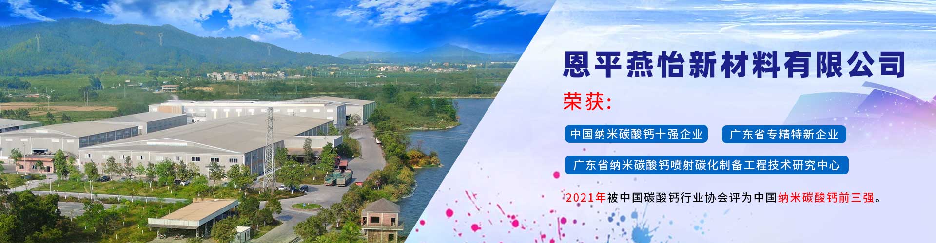 恩平燕怡新材料有限公司成立于2006年,位于廣東省江門恩平市。是一家專注于納米碳酸鈣產(chǎn)品研發(fā)、生產(chǎn)以及銷售服務(wù)的新材料企業(yè)。 公司榮獲 “高新技術(shù)企業(yè)”、 “清潔生產(chǎn)企業(yè)”、“廣東省納米碳酸鈣噴射碳化制備工程技術(shù)研究中心” 、 “中國納米碳酸鈣十強企業(yè)” 、 “廣東省專精特新企業(yè)”等稱號,并通過ISO9001:2015質(zhì)量管理體系認(rèn)證,產(chǎn)品質(zhì)量符合國家行業(yè)標(biāo)準(zhǔn)GB/T19590—2011納米碳酸鈣優(yōu)等品的要求。...